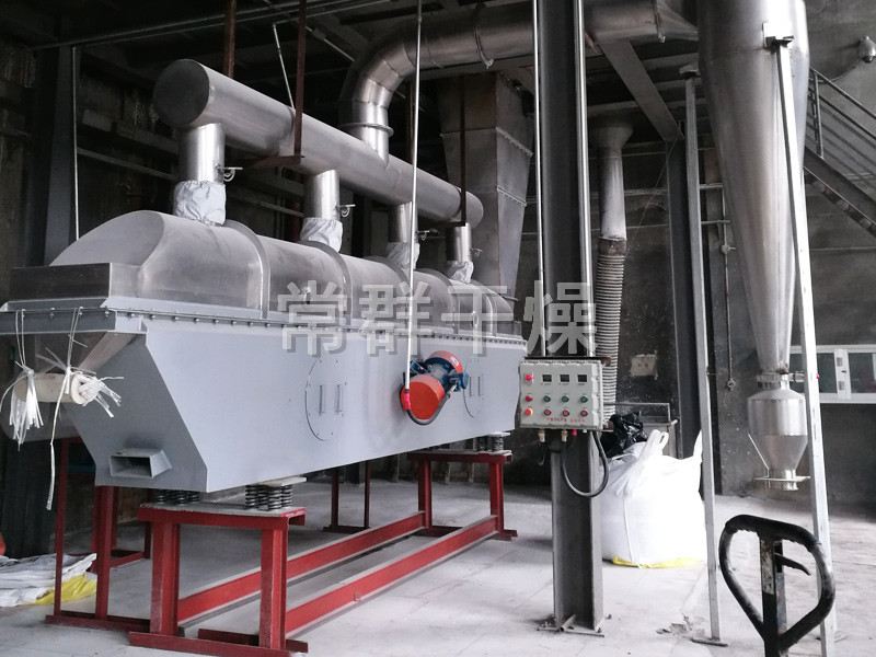 物料自進料進口進入機內,在振動力作用下,物料沿水平面流化床拋擲,向前連續運動,熱風向上穿過流化床同濕物料換熱后,濕空氣經旋風分離器除塵后由排風1:3排出,干燥物料由排料進口排出。