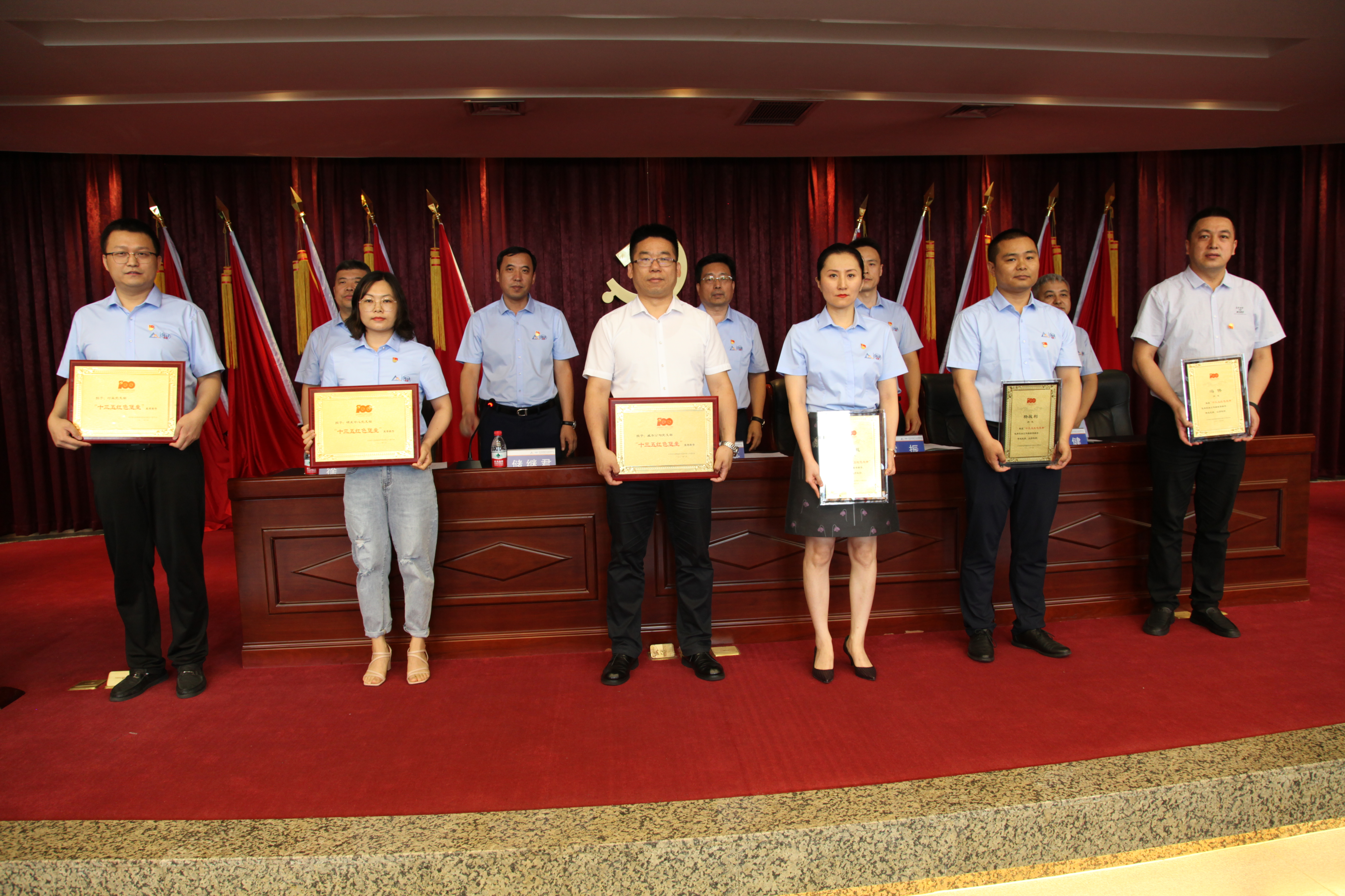 會議在莊嚴國歌聲中拉開序幕。2020、2021年新發展的黨員高舉右拳莊嚴宣誓,鏗鏘有力的誓言表達了為共產主義事業奮斗終身的決心。隨后,黨委委員、副總經理雷振代表黨委宣讀了先優表彰決定,領導班子成員為受到表彰的先進集體和優秀個人頒發獎牌。