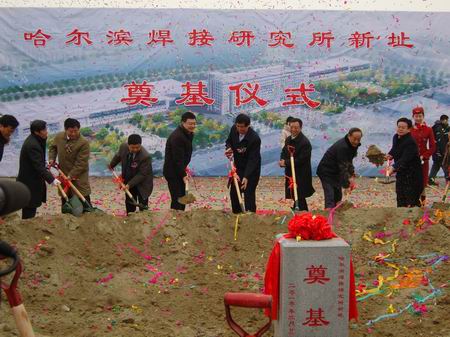 上午十時(shí)左右,一個(gè)讓我們永遠(yuǎn)銘記的歷史時(shí)刻到來了。國家科技部的有關(guān)領(lǐng)導(dǎo)、黑龍江省栗戰(zhàn)書省長(zhǎng)、哈爾濱市蓋如垠書記、張效廉市長(zhǎng)、省科技廳趙敏廳長(zhǎng)等省市領(lǐng)導(dǎo)和有關(guān)方面的負(fù)責(zé)人以及機(jī)械科學(xué)研究總院李新亞院長(zhǎng)、曹世清書記,哈爾濱焊接研究所何實(shí)所長(zhǎng)、楊玉亭書記及所班子成員一行來到會(huì)場(chǎng),揮鍬填土,為哈爾濱市科技創(chuàng)新城哈焊所新址開工奠基。這時(shí),音樂奏響,鞭炮齊鳴,彩帶飛舞,歡聲雷動(dòng)。參加開工奠基儀式的人們?nèi)呵榧^,共同為哈焊所五十多年來取得的成就歡呼,共同憧憬哈焊所美好的明天。
